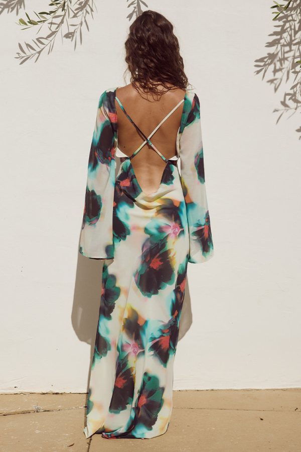 With dramatic bell sleeves and an open back, our Kimber Maxi Dress is the perfectly refined feminine piece.